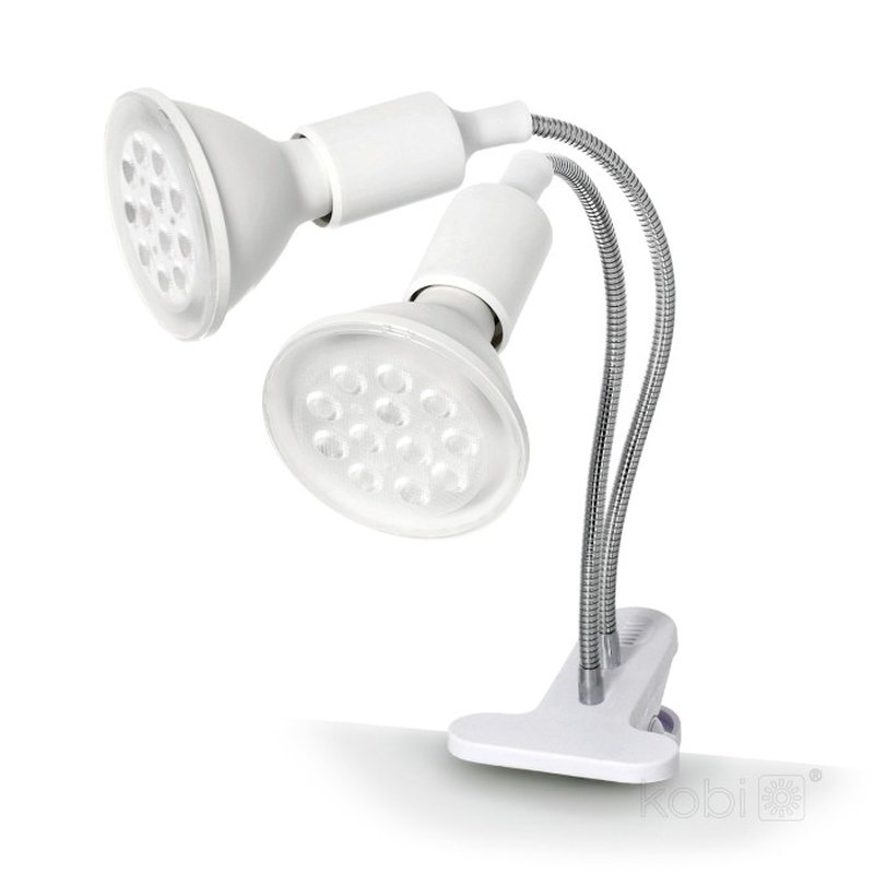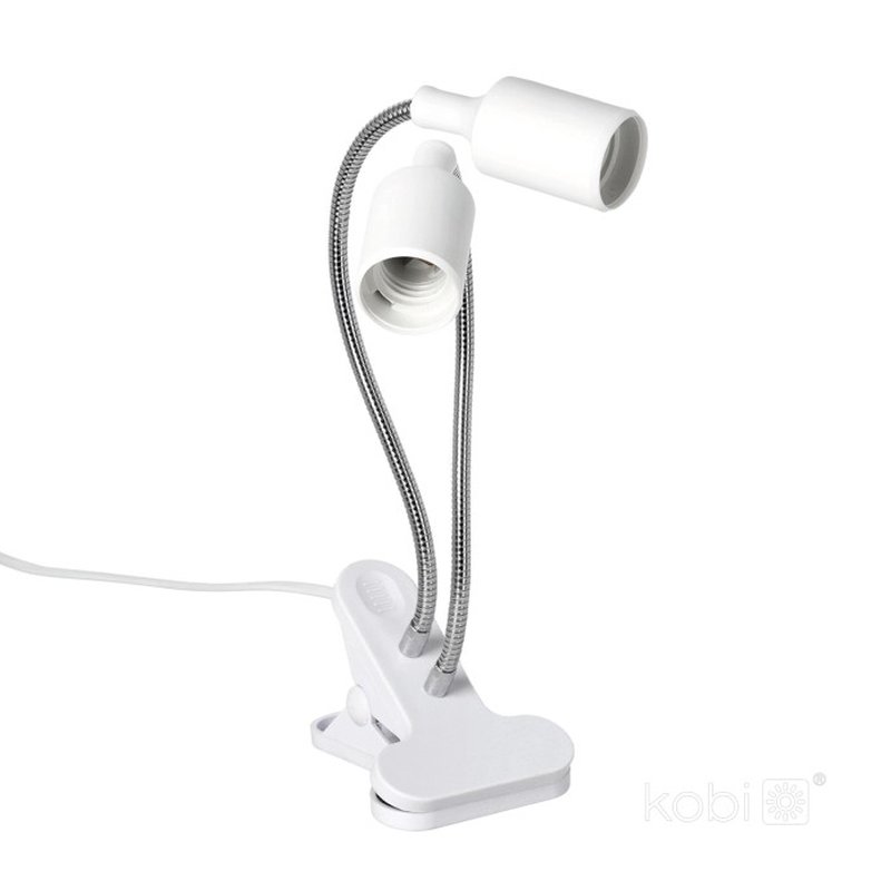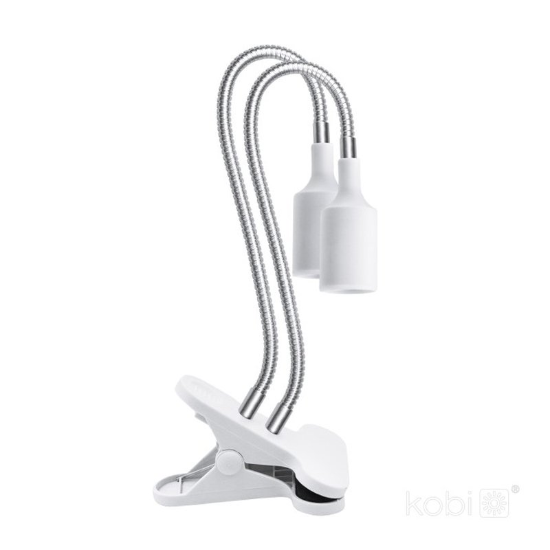 Lámpara con soporte de clip, con dos brazos, diseñada específicamente para utilizarse con bombillas LED de crecimiento (rosca estándar) que impulsan el desarrollo de tus plantas. Montaje con clip y 2 brazos flexibles y ajustables. Incluye un cable de 1,7m. Es la solución ideal para espacios interiores con acceso limitado a la luz natural. Color blanco