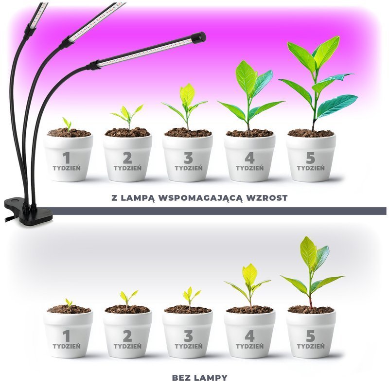 Este dispositivo emite un espectro lumínico específico que garantiza la fotosíntesis y un crecimiento natural en interiores. Para un resultado óptimo, asegure también el riego y sustrato adecuados para su planta.